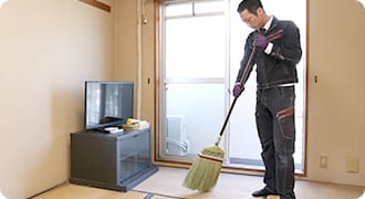 遺品整理後に遺品整理プロスタッフ神戸のサービスで掃き掃除を実施。簡易清掃後、すっきりしたお部屋の隅々までお客様にご確認いただきます。