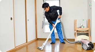 神戸の遺品整理プロスタッフのサービスで、作業後に掃き掃除を行います。簡易清掃ですっきりさせたお部屋を、ご遺族様に隅々までご確認いただきます。