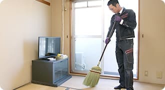 04  簡易清掃遺品整理作業後には、遺品整理プロスタッフ京都では恒例の掃き掃除を行ってチリ・ホコリを取り除きます。簡易清掃後、京都府のご遺族様にすべてのお部屋をご確認いただきます。