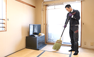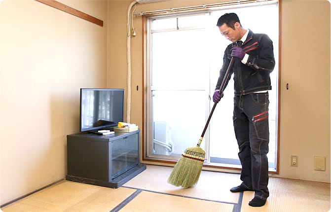 遺品整理後は掃き掃除のサービスを実施。物陰にたまっていたチリやホコリを取り除きます。それから、作業内容をご依頼主様にご確認いただきます。