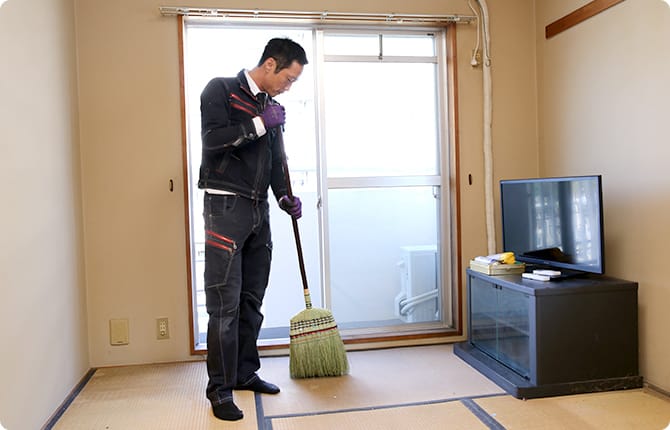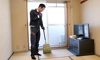 ゴミ屋敷の片付け時には、長年蓄積されていたチリやホコリが表に顔を出します。遺品整理プロスタッフでは、お客様に少しでもすっきりした気分を味わっていただくために、作業終了後にサービスで掃き掃除を行っています。それからお部屋の状態をご確認いただきます。なお、汚れが酷い場合はハウスクリーニングのご利用をおすすめしています。